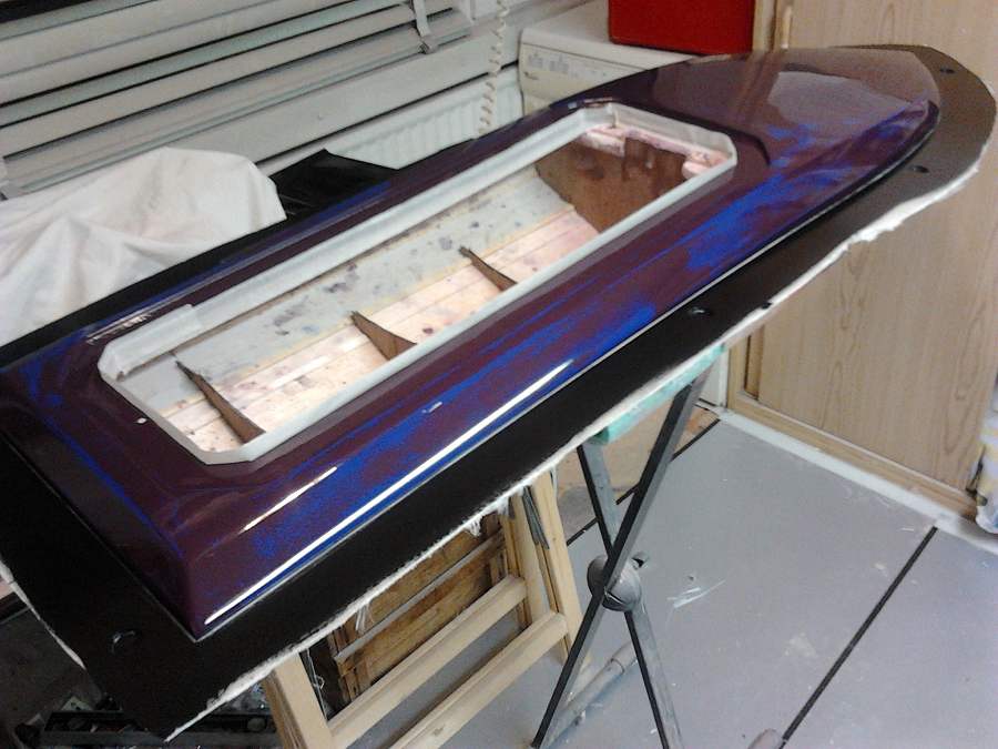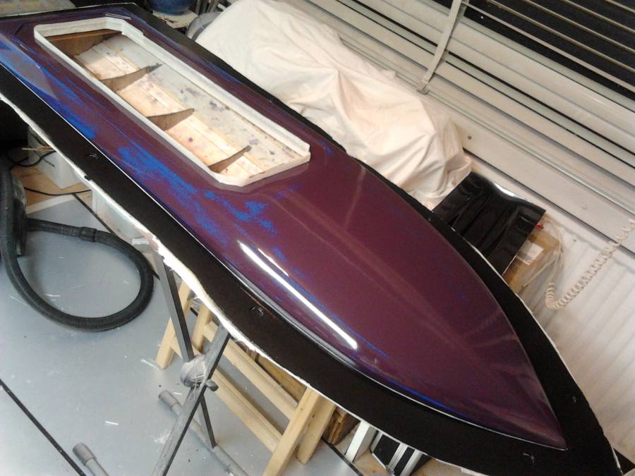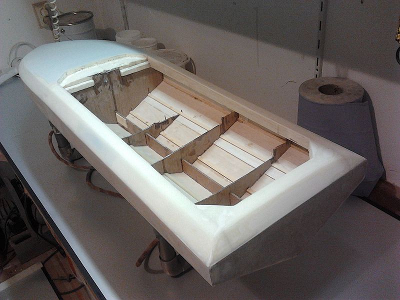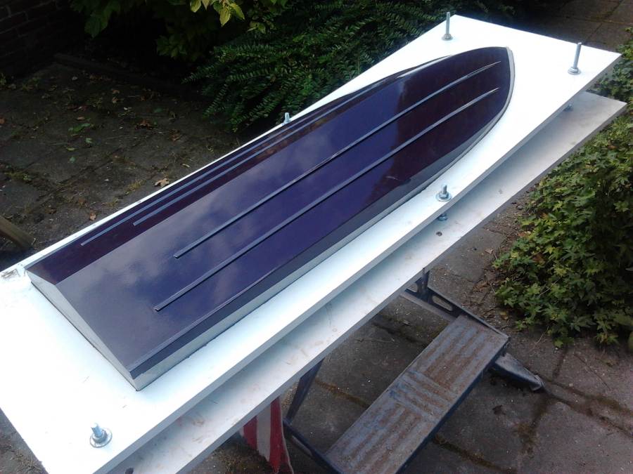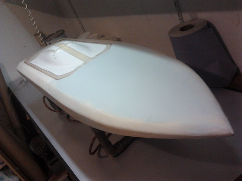 I did not like the shape of the hulls already available; either not performing or just plain ugly. On the basis of a known 45 inch hull and with the permission of it's original builder/designer, i digitised the hull and increased it's size to 49x14 inches. Just about right to fill the gap between the 45 and 55inch hulls. Project name; Commander (as the Lancer 55 also a Chris Craft type). Easy acces with a big cowl opening (and also easier to laminate the wet-in-wet deck/hull seam). The plug, built up in wood/balsa/foam, is now laminated and the finishing has started; "filler-on-filler-off". The cowl is still in development.